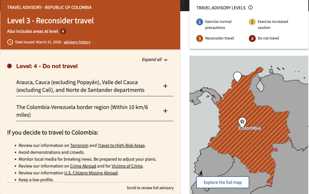 La advertencia mantiene a Colombia en nivel 3, lo que implica “reconsiderar el viaje”, pero eleva a nivel 4 —el más alto— a regiones específicas donde se aconseja no viajar bajo ninguna circunstancia.