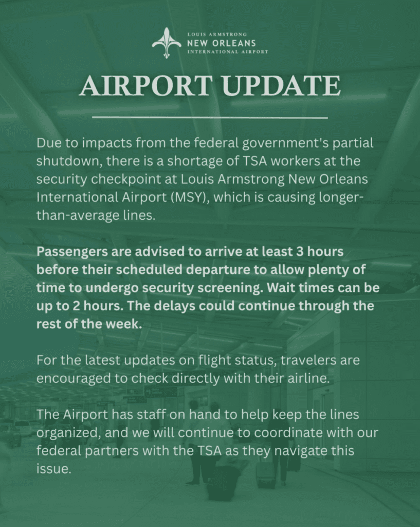 Los viajeros que salgan desde MSY deben consultar directamente con sus aerolíneas para conocer actualizaciones sobre el estado de sus vuelos.
